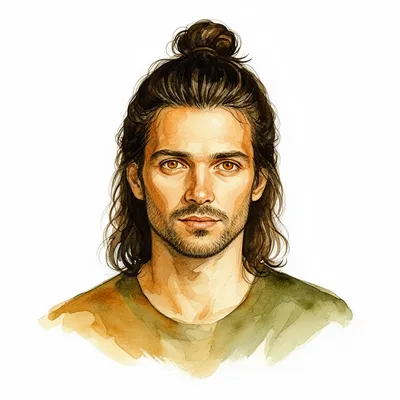 WatercolorArtistic watercolor AI avatar featuring a thoughtful man with long dark hair, warm amber eyes, and earthy color palette perfect for creative profiles.