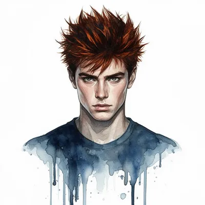 WatercolorArtistic watercolor AI avatar of a serious young man with copper hair and intense grey-green eyes, featuring elegant blue and indigo color drips on minimalist background.