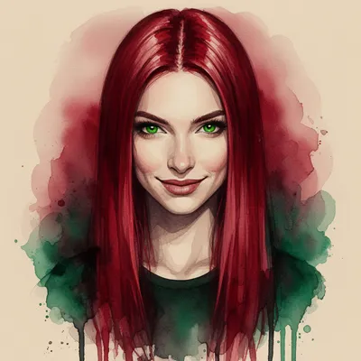 Soft watercolor AI-generated avatar featuring a mysterious woman with cherry red hair and emerald green eyes, blending artistic style and digital creativity.