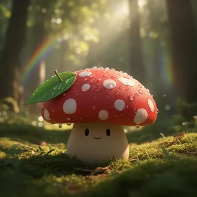 3D RenderEnchanting 3D render avatar of a playful mushroom person with vibrant red spotted cap, leaf umbrella, and magical forest details in soft, warm lighting.