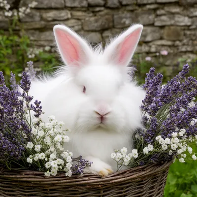 PetsSerene white angora rabbit avatar nestled in a flower basket, soft pastoral style with English garden charm and luminous fur perfect for cute profile images.